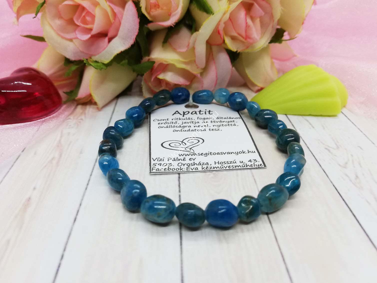 Csontritkulást segítő apatit ásvány karkötő. Minden terület működését fokozza, javítja az étvágyat, az ellenálló képességet, az idegeket, serkenti a gyógyulást. Hasznos a csontritkulásnál, megkönnyíti a csonttörések gyógyulását. A kő segítségével csontritkulás esetében is elérhető a csontsűrűség javulása, a fogakra, sejtekre, ízületekre is pozitívan hat. Nyitottá tesz, így segíti a közösségbe való beilleszkedést is. Lelki vonatkozásban fokozza az öntudatot, önállóságra, céltudatosságra serkent, erősíti a motivációt.